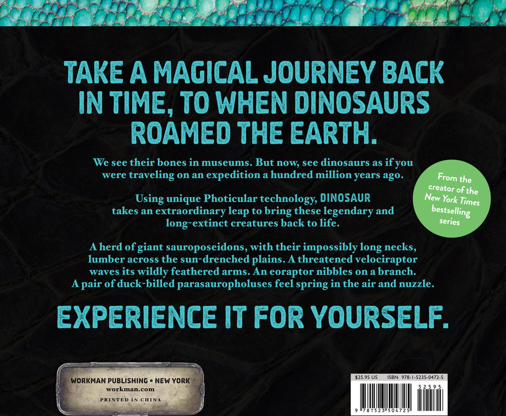 Using unique Photicular® technology that’s like a 3-D movie on the page, DINOSAUR brings these legendary, long-extinct creatures to life. Each image delivers a rich, immersive visual experience—and the result is breathtaking. There’s a herd of giant sauroposeidons, with their impossibly long necks, lumbering across the sun-drenched plains, a threatened velociraptor waving its wildly feathered arms, and more.