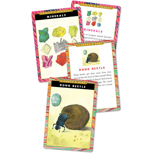 The cards are divided into six categories: Flowers and Bugs, Mammals and Marsupials, Under the Water, Birds and Leaves, Weather and Celestial, Fossils and Minerals.