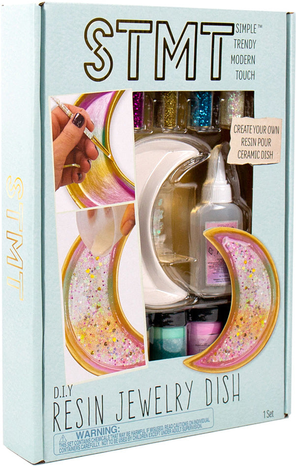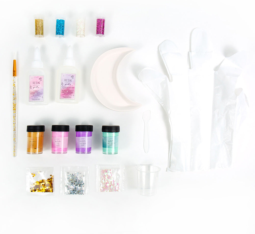 Resin is 'in' and this kit will teach you how to use it! Explore the art of resin pouring and create your own ceramic, moon-shaped, jewelry holder. Kit includes 2 bottles of liquid resin, 1 ceramic moon-shaped trinket dish, metallic paints, paintbrush, confetti, glitter shakers, gloves, measuring cup, spatula, and easy-to-follow instructions. This kit is over the moon!