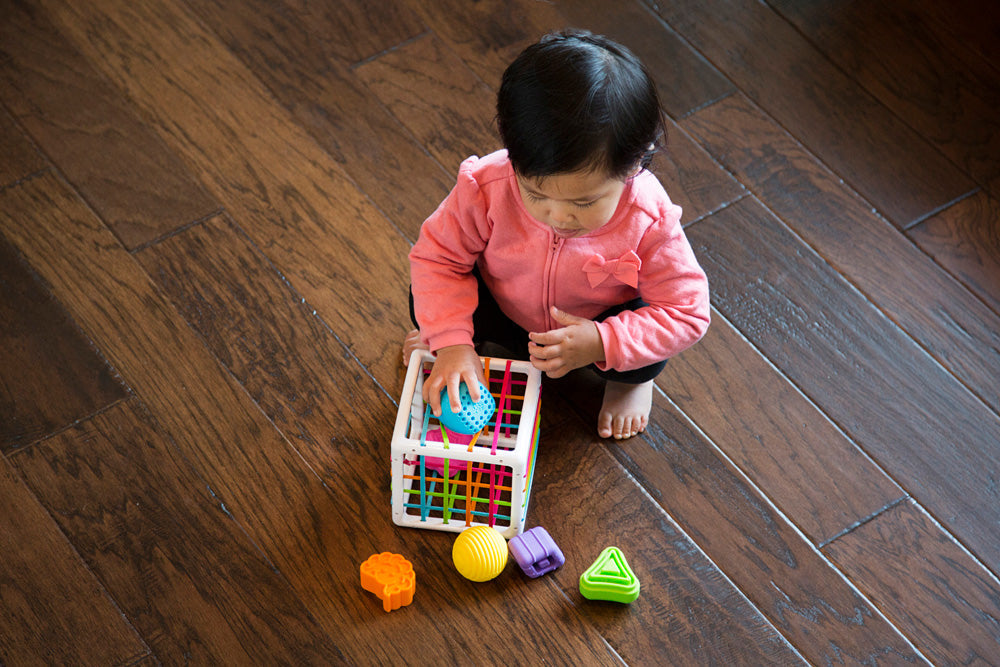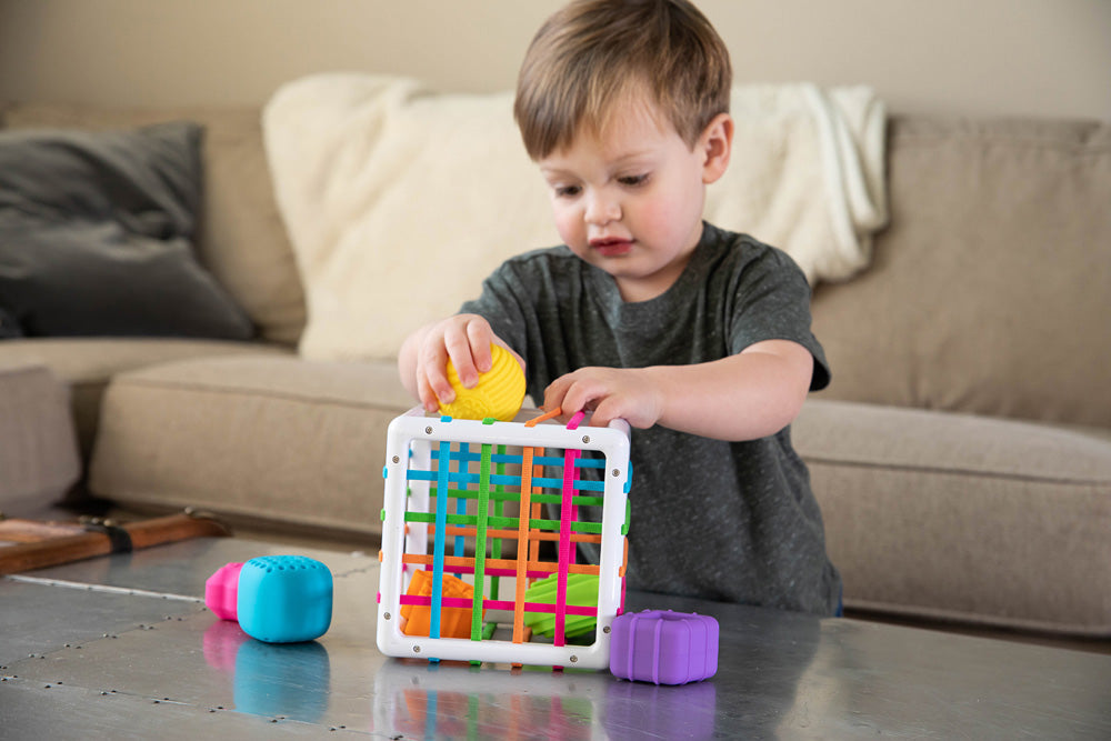 Here are six chunky, textured blocks to delight and challenge little ones as they push each shape through the elastic bands of this cube. In, out, repeat. Each time brings a little more curiosity, joy, and yes, learning.