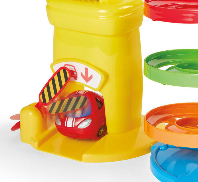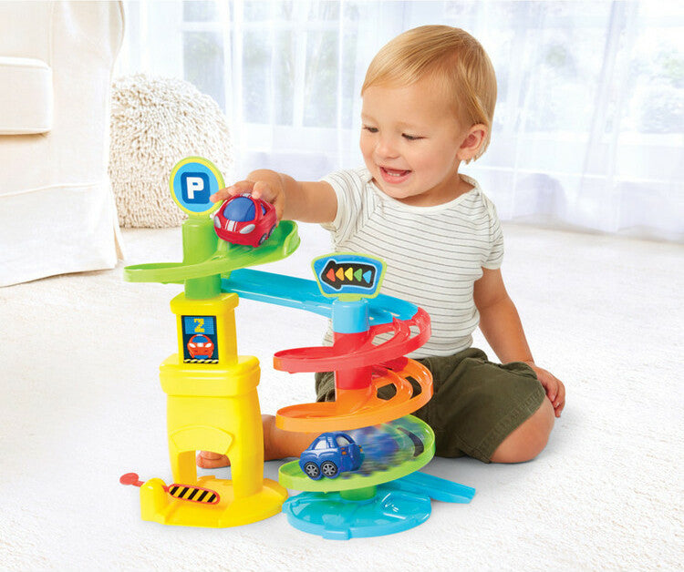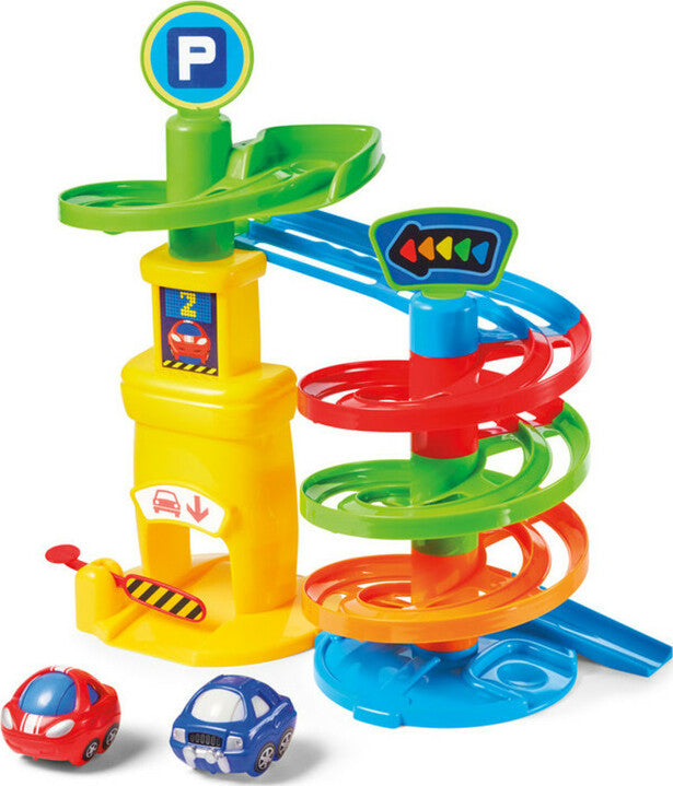 Kidoozie’s Park and Roll Garage is a kid powered playset with 4 levels of fun and 2 vehicles included. Park the vehicles at the top of the garage and watch them spiral down the exit! Studies show that introducing children to beneficial skills early on in development leads to more attuned mental faculties. Park and Roll Garage engages and enhance children's fine motor skills and promotes imaginative play. To help engross children in fun and beneficial playtime, this set includes two colorful vehicles that wobble as they race down the playset track. Parking gate opens and closes for added playtime. Like all Kidoozie products, this play set was built using only safe and top-quality materials that will last your child for years to come. This toy is ideal for broadening mental faculties through creative play in young children. Package includes 1 Park and Roll Garage with playset and two vehicles. Suitable for children ages 18 months and older.