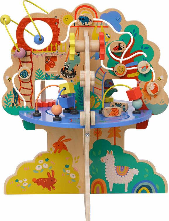 Playground-themed fun all in one wood activity center! Discover four quadrants packed full of playful activities including 20 gliders on seven different tracks, an abacus track, five beads runs, two spinners, a springy bear riding a dinosaur and more! Plus, this delightful activity center is covered in playground-themed illustrations that bring the fun of the playground inside. Encourages cause and effect learning and motor skill development. Adult assembly required - hardware included.