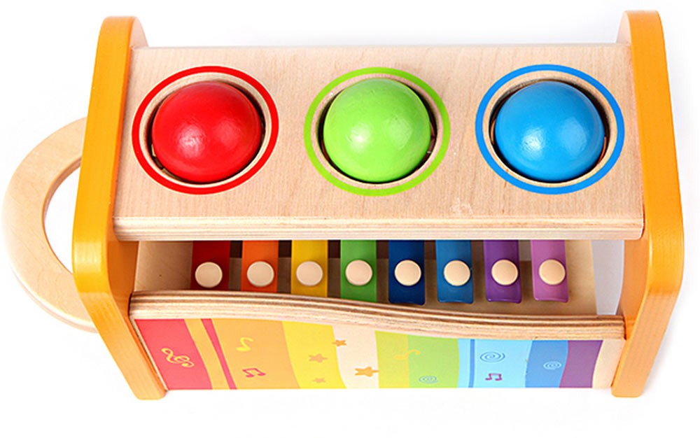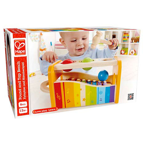 Is it a busy bench, or a xylophone? The answer is yes! When baby pounds the balls through, they drop onto the keys below, tinkling out melodic sounds. Tired of hammering? Remove the keyboard and let the concert begin. A 3-in-1 award winner that employs dexterity, logic and cause and effect. From Hape Intl, for ages 1-3 yrs.