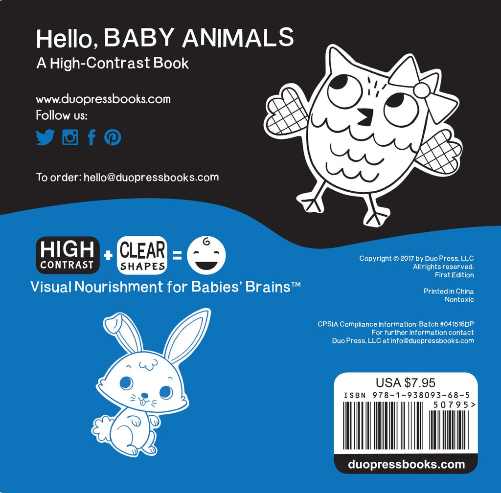 Making connections between images on a page and the real world is an important building block for your baby’s communication skills—and this charming introduction to ten baby animals, paired with friendly greetings and bold, basic patterns, provides a great high-contrast experience for young developing eyes. As newborns’ vision is not developed enough to recognize colors, severe black-and-white contrast of patterns and images allow their eyes to differentiate between what they’re seeing. Sure to grab little ones' attention!