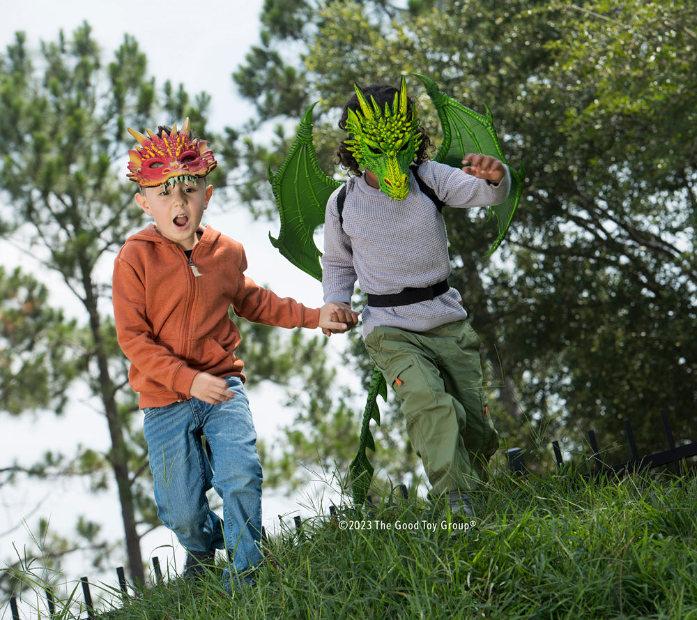 Discover a dragon mask that's head and smolders above the rest! Fire up imaginary play in fantastic worlds of wonder by adding this beautifully designed mask to your child's dress-up collection. It's made from high-quality, rubberized foam, making it comfortable for hours of wear and durable for years of pretend play. The rubberized texture makes it feel like real dragon scales! Features an adjustable strap for a snug and secure fit, and wide eye openings to keep your little dragon safe while still looking fierce. Pair with green dragon mask for sibling playtime or BFF Halloween costumes.