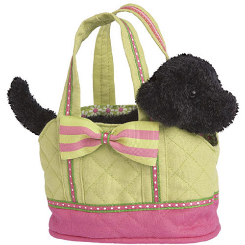Carry Douglas' Sweet Leopard Sassy Pet Sak and show the world your wild side! Enveloped in gray leopard spots scattered over a pastel pink background, this handbag boasts a classic look. A silky pink bow embellishes the side, while satin twist cord handles let the littlest fashionistas carry this accessory with ease. Nestled luxuriantly within, a small, white puppy stuffed animal waits to meet her new caretaker. Ultra soft plush fur and a bright-eyed expression make this little dog an engaging companion. The perfect size to hold all of life's necessities and your loyal pet, this purse is an appealing accessory for dress-up play or going out on the town!