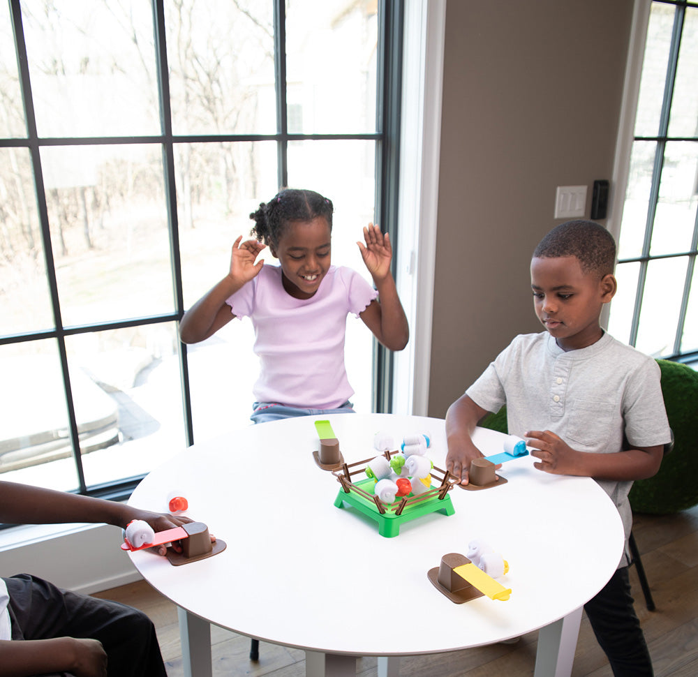 Taking turns, players use their springboard to launch their sheep onto the hook-and-loop paddock.