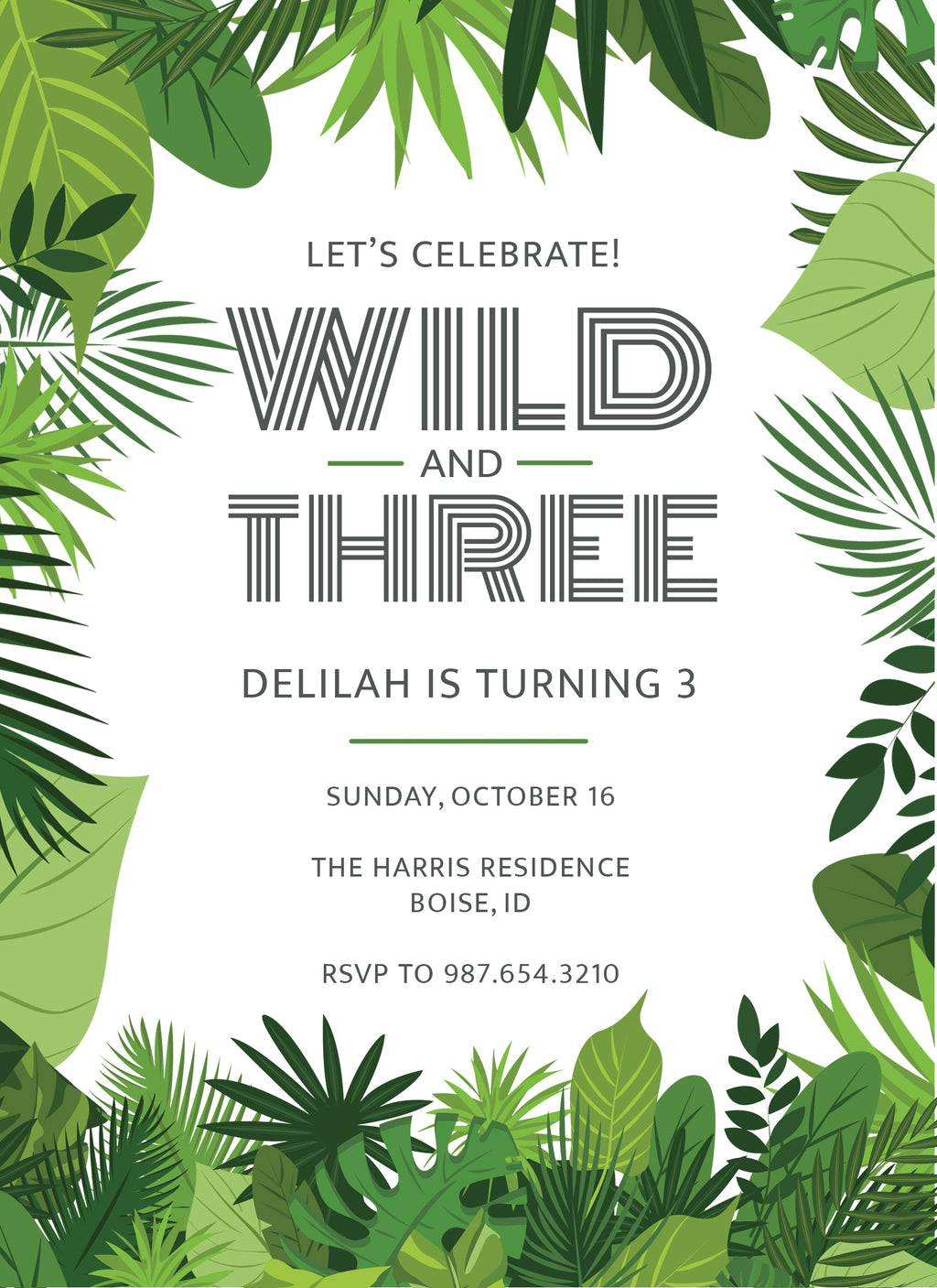 Is your little one ready to be "wild & three"? Celebrate with this leafy green jungle-themed invite. Simply add your party info and send to print.