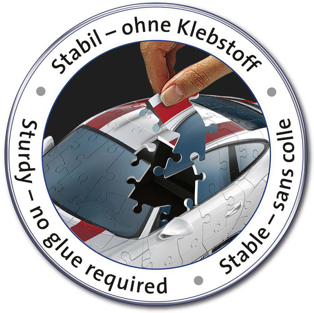 108 pc 3D Puzzle The legendary 911 was built for racing in 2016 and production was exclusively limited; with Ravensburger 3D Puzzle dreams of owning this engine have come to life with this authentic design. On a scale of 1:18, the Porsche 911 3D Puzzle is the perfect miniature, with elegant lines and a classically white design appealing to any racing enthusiast. The 108 sturdy plastic puzzle pieces are individually shaped, partly bendable and fit perfectly together with Easyclick technology - no need for glue! An automotive experience that makes the pulse of motoring fanatics beat faster, the rotating wheels on this 3D Puzzle add the final touch. With the help of the illustrated instructions, this sleek structure will be suitable for beginners or advanced puzzlers from the ages of 10 and up and will guarantee a sense of achievement and hours of puzzling fun. This puzzle uses unique plastic pieces, which slot together to build this sturdy and strong model. No glue required! Each puzzle piece is printed with a number on the reverse side, so you can either assemble the puzzle by eye, or just by following the numbers. Contents: 108 piece plastic 3D puzzle