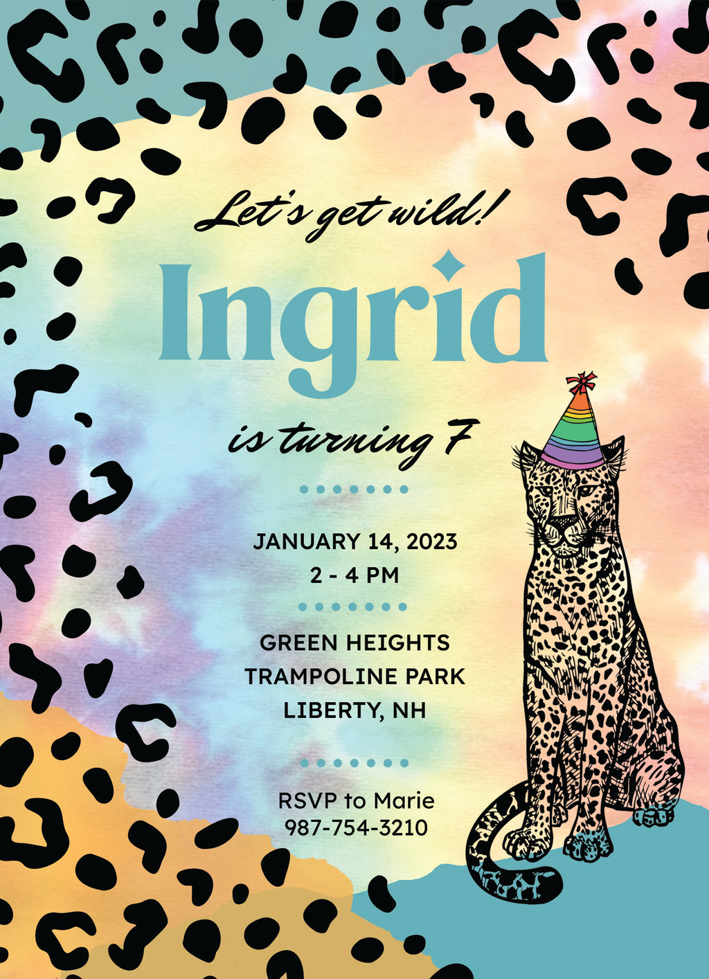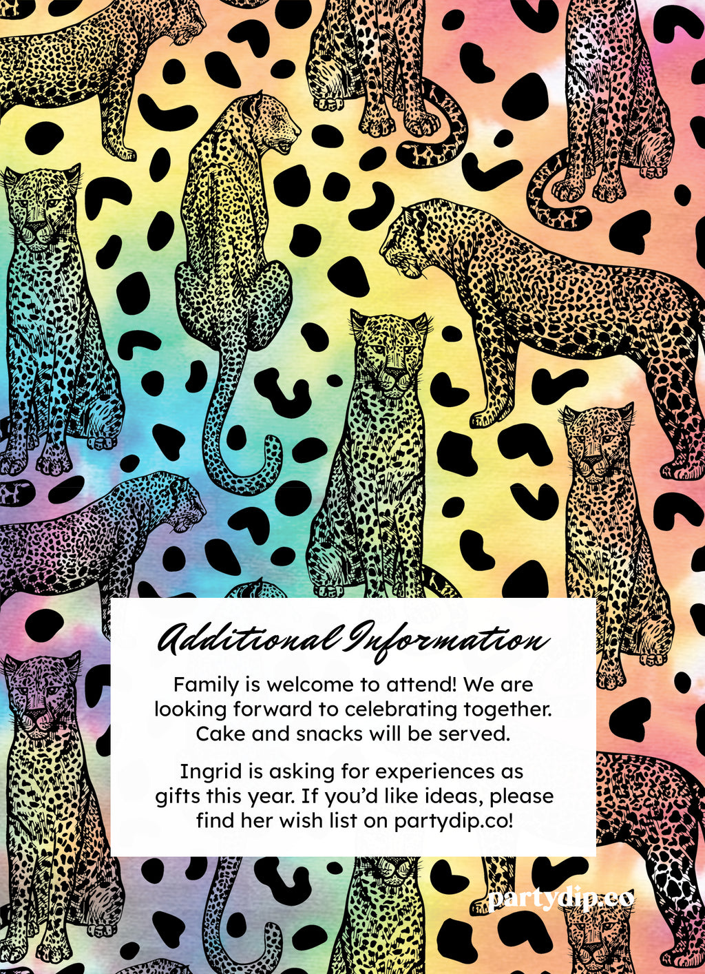 This colorful invite is as unique as a leopard's spots! Simply add the info and send to print.