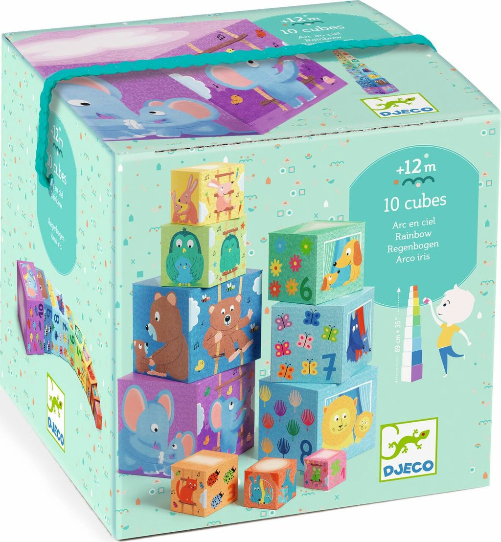 Nesting cubes in the colors of the rainbow. 10 thick cardboard blocks to fit together, pile up and knock down as many times as you like! Children stack the cubes so that the illustrations create a logical sequence.