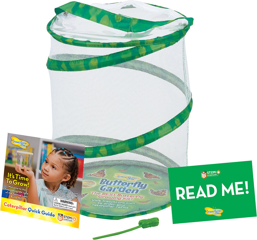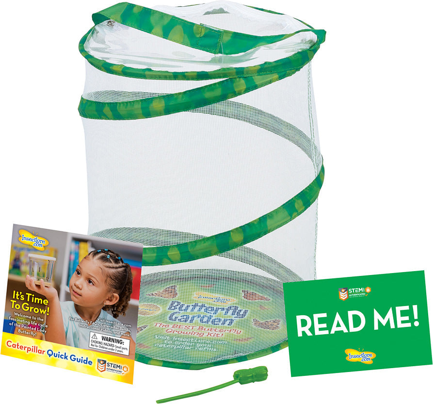 Budding scientists love this hands-on opportunity to learn about the magic of metamorphosis! Over the course of 3 weeks, families watch caterpillars transform to chrysalides, then to Painted Lady butterflies inside the pop-up 12" mesh habitat. After observation, release butterflies into the garden as pollinators! Kit also includes a feeding dropper, instructions, and a STEM Butterfly Observation Journal filled with fun learning activities. Live insects not included; simply redeem the included voucher to receive baby caterpillars, food, and a chrysalis holding log via mail. It's a unique gift!