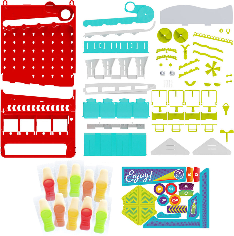 Ever dreamed of having a vending machine in your room? With this engineering kit, you can build and experiment with your own toy vending machine. First, follow the step-by-step instructions to assemble the machine. Then test and configure it to get it working perfectly. Load your vending machine with the included soda-bottle gummy candies or any other small candies or prizes you supply, and you're in business! Insert some coins and have fun watching them get sorted, perform stunts as they slide down the tracks, dispense prizes, and finally end up in the coin bank in the base of the machine.