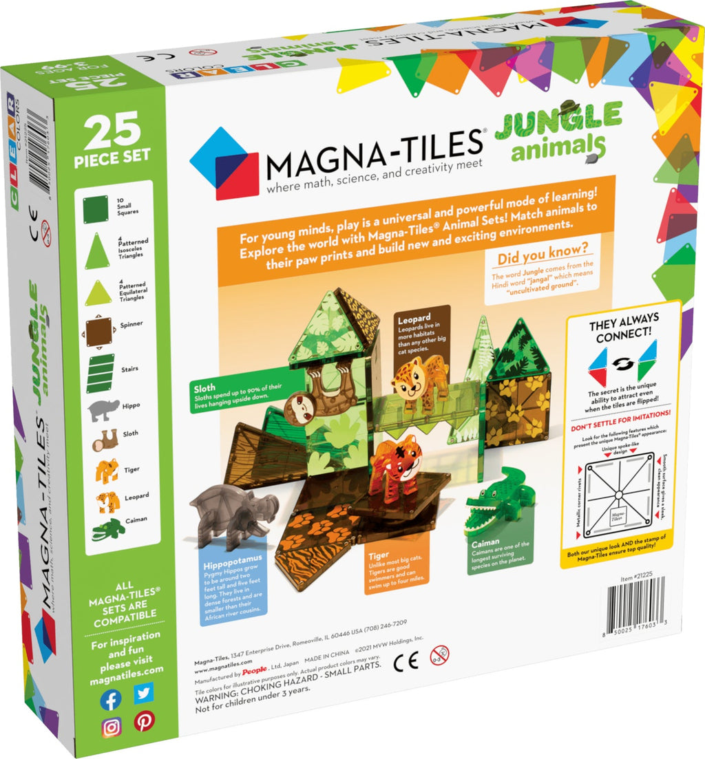Creativity reigns in the Magna-Tile universe, where imaginations run wild. The sky's the limit with this beautiful 25 piece set, with magnetic shapes that offer limitless open play and exploration. This Jungle animals set comes with 10 squares, 2 types of triangles, spinner and stairs, plus a sloth, hippo, tiger, leopard and caiman - all compatible with every other Magna-Tiles sets. Children over 3 can easily manipulate the tiles to build homes for the animals, dream up adventures, or create whole new worlds while developing STEM skills. Find fun facts about each animal on the box, too!