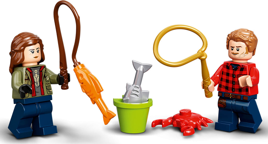 Quick-build buggy and dock – The toy buggy has a Starter Brick chassis to make building easier, and a seat for Owen Grady. The dock features a stall with fish and crab elements