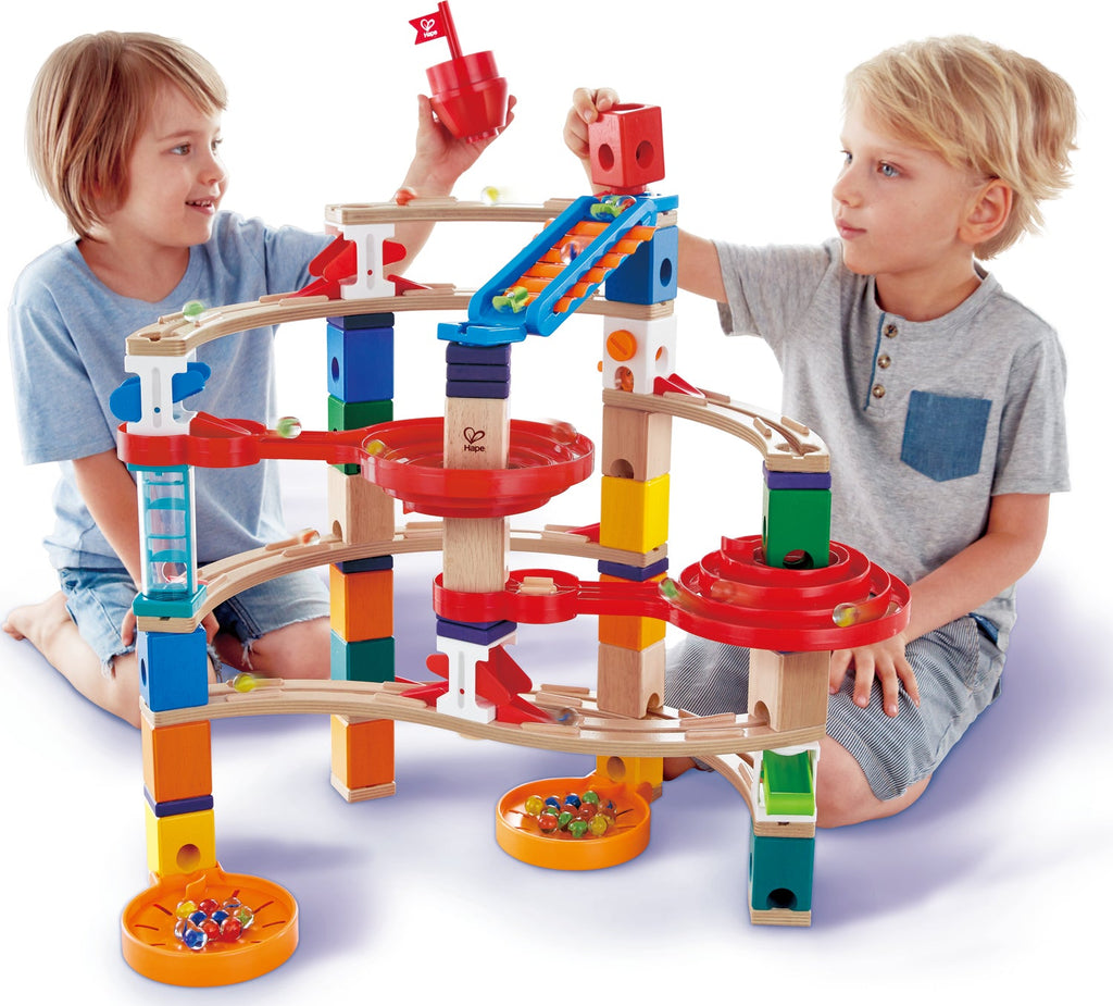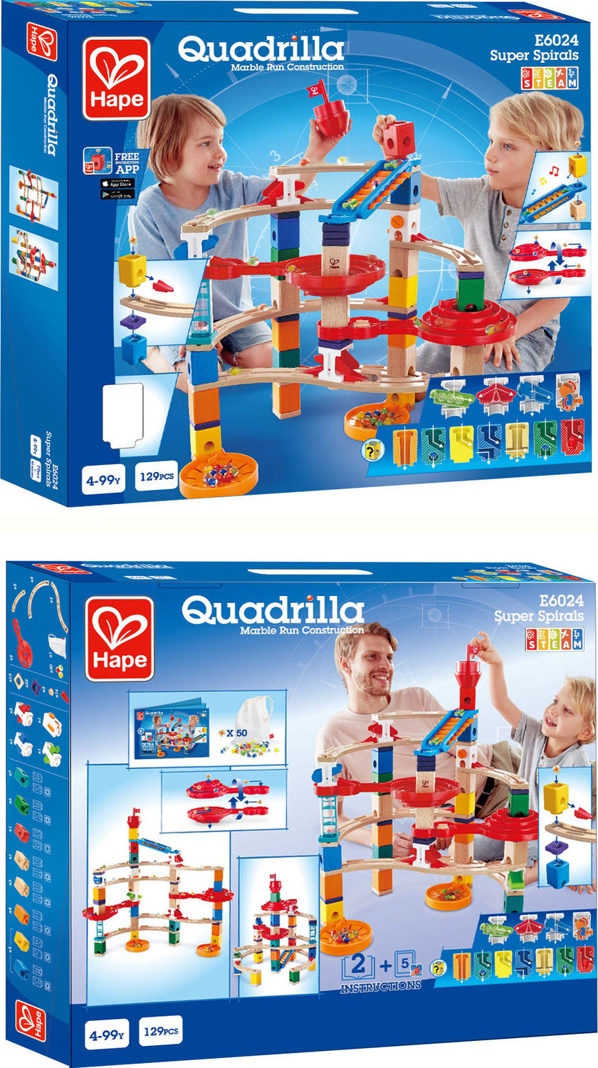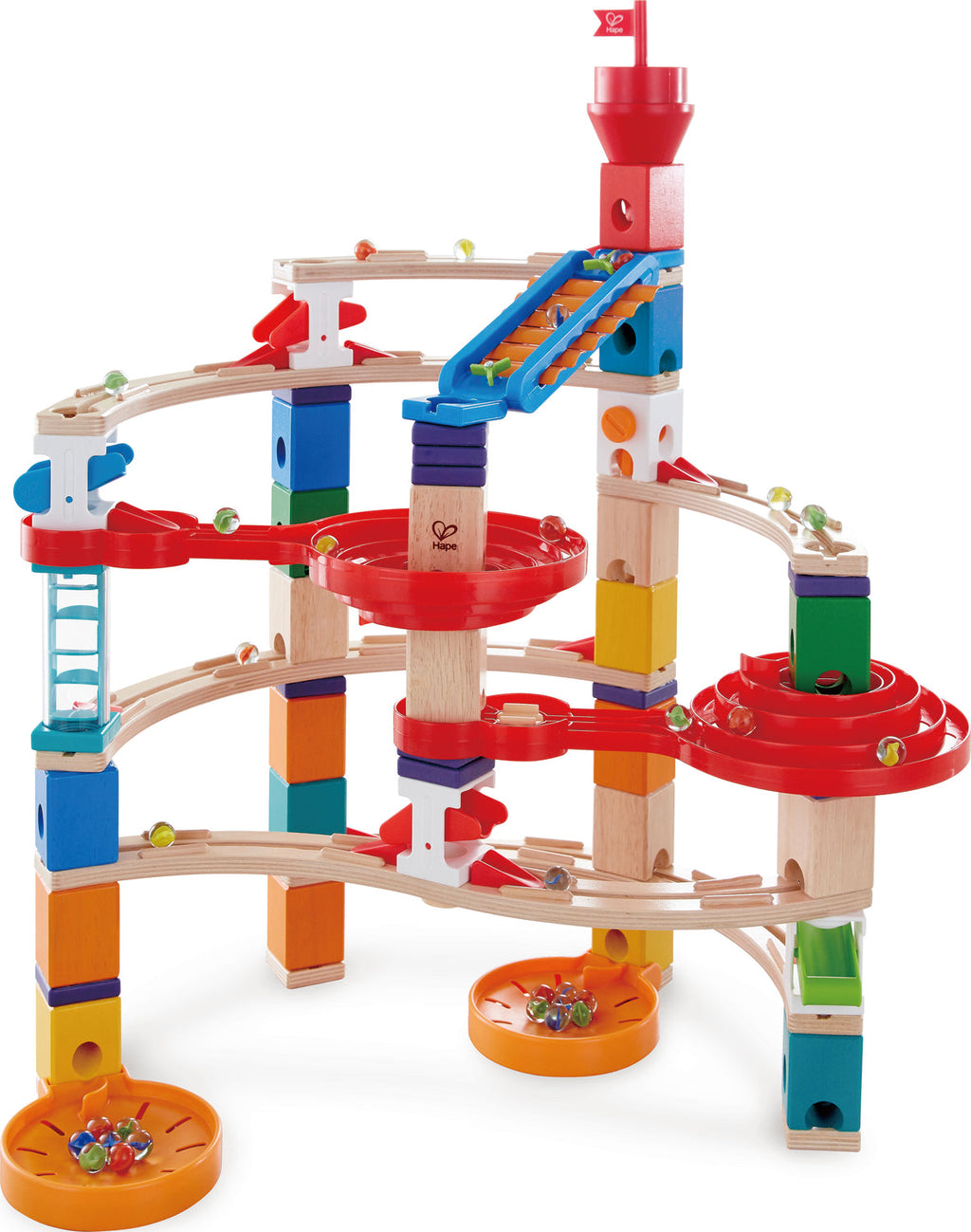 Get more spinning and more surprises with this deluxe Quadrilla set. Includes a xylophone rail that plays a tune as marbles run over it, two double-sided spiral twists, plus four special control blocks to randomly distribute marbles.