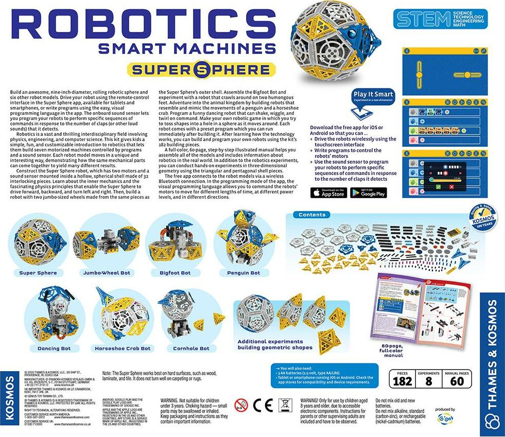 Construct the Super Sphere robot, which has two motors and a sound sensor mounted inside a hollow, spherical shell made of 32 interlocking plastic pieces. Learn about the inner mechanics and the fascinating physics principles that enable the Super Sphere to drive forward, backward, and turn left and right. Then, build a robot with two jumbo-sized wheels made from the same pieces as the Super Sphere’s outer shell. Assemble the Bigfoot Bot and experiment with a robot that crawls around on two humongous feet. Adventure into the animal kingdom by building robots that resemble and mimic the movements of a penguin and a horseshoe crab. Program a funny dancing robot that can shake, wiggle, and twirl on command. Make your own robotic game of cornhole and try to toss the pieces into the hole as it moves around. Each robot comes with a preset program which you can run immediately after building it. After learning how the technology works, you can build and program your own robots using the kit’s 182 building pieces.