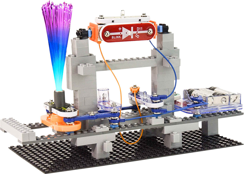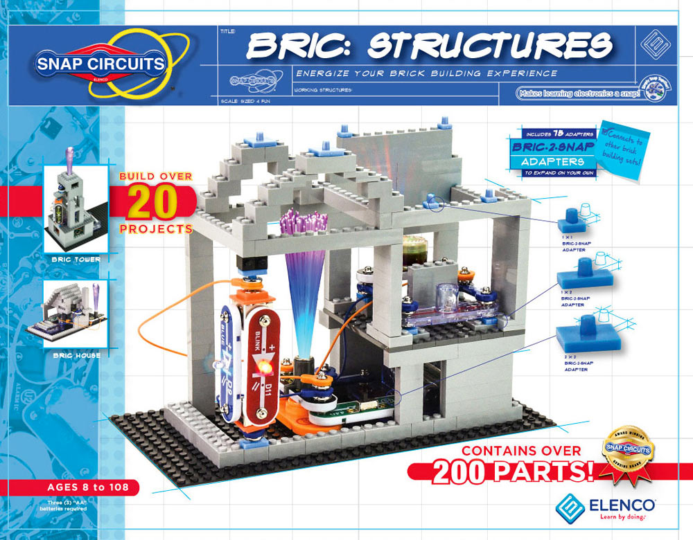 Brick building just got electrified! Endless circuitry combinations infuse bricks with lights, sounds and movement. A beautiful award winning set with full-color manual, 20 Snap Circuit parts, 75 Bric-to-Snap parts, and 140 compatible bricks. Requires 3 AA batteries.