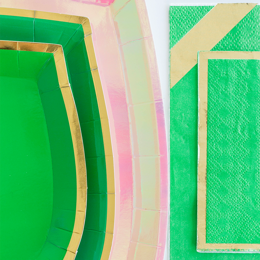 Basics that are anything but, our Posh Collection is the luxe way to set your table. From On Wednesdays pink to Oh Kale No green, we’ve got you covered in colors for any occasion with 10 solids with fab gold foiled rims and 9 solid foil designs.