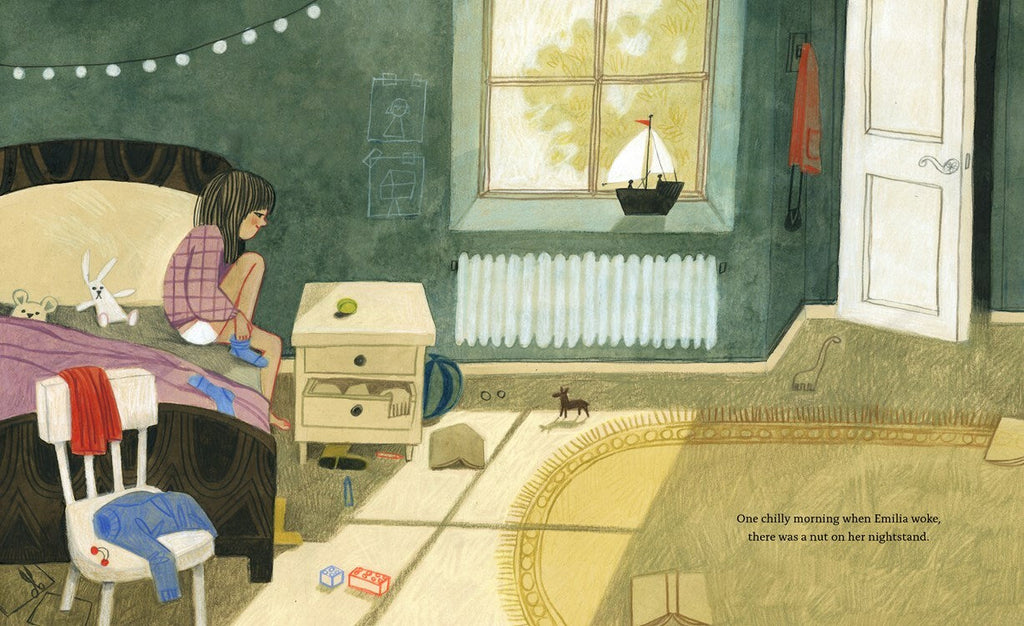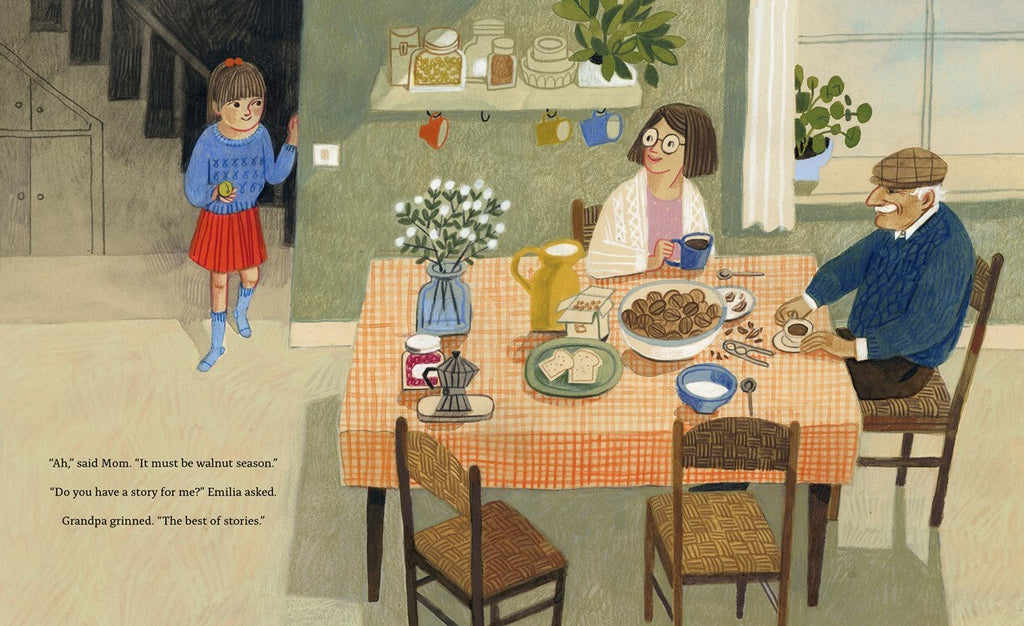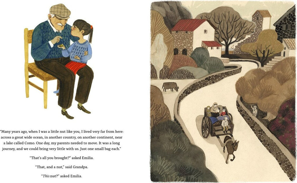 When Emilia finds a walnut one morning, Grandpa tells her the story behind it: of his journey across the ocean to a new home, with only one small bag and a nut in his pocket.