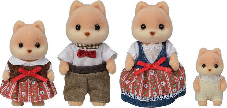 Caramel Dog Family contains four cute and small-eared dog figures: Father, Mother, Girl, and Baby. The figures' heads and limbs are movable, allowing you to change their poses.