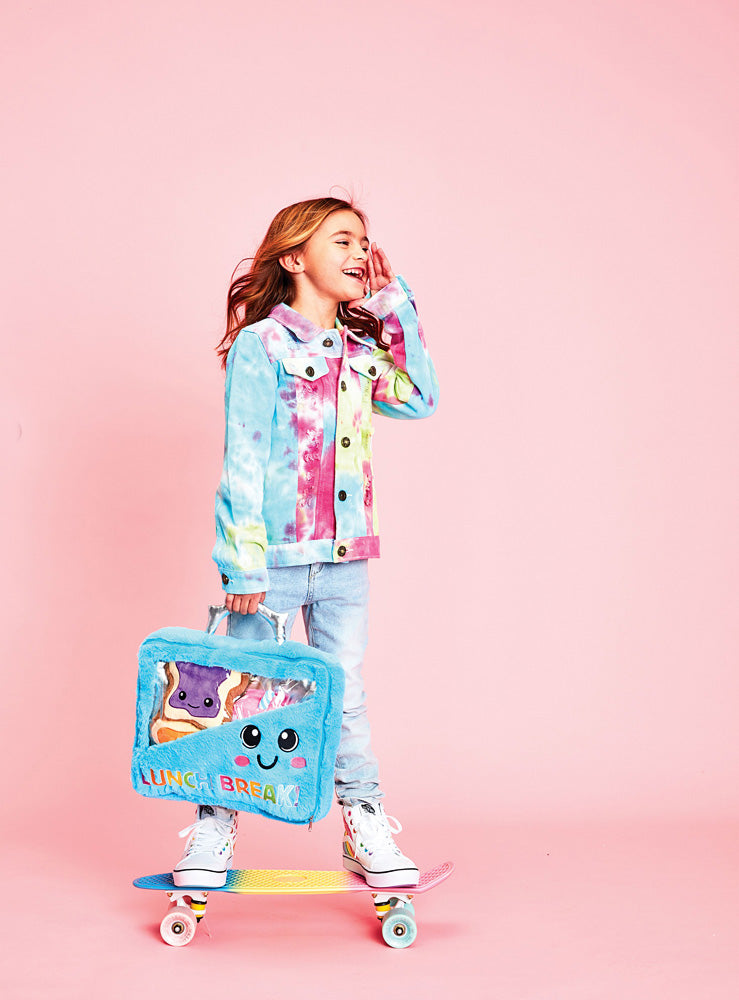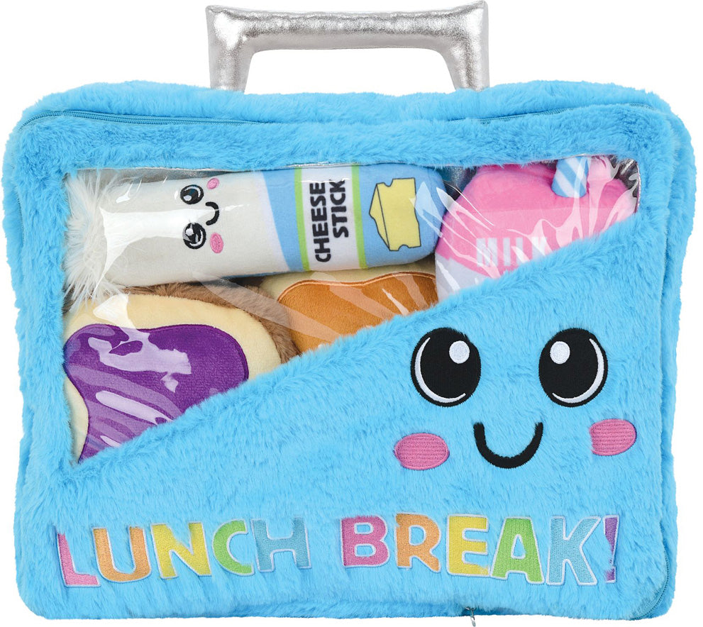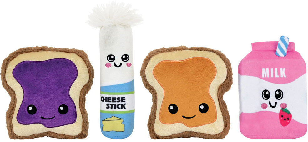 What a tasty idea! Neatly packed inside the zippered, fabulous fuzzy "lunchbox" are 4 furry, smiling ingredients: milk, cheese stick, peanut butter on bread, and jelly on bread. Embroidered detailing makes them irresistible. Approximately 13x12x5" in size.