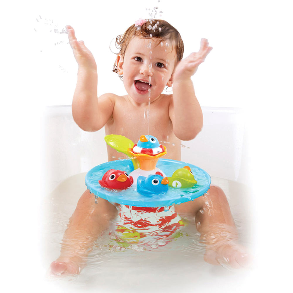 Good luck getting all 5 cutie pies out of the tub – the 4 racing ducklings and your happy toddler! There's a fountain that whirls and circulates water around a track, with 9 musical sound effects. Requires 4 AA batteries.
