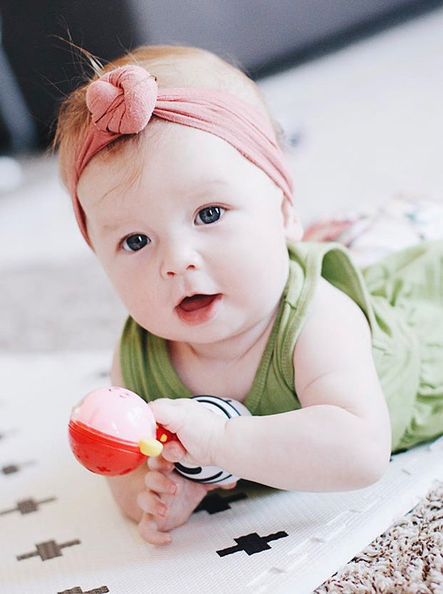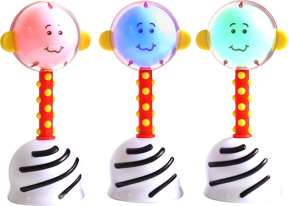 Don't let this cutie-pie deceive you, because it has a powerful agenda–to help baby reach milestones by engaging three important senses. Red, blue and green lights encourage visual tracking. The soft rattle sound awakens baby's hearing, and the textured handle helps little paws get a grip on tactile motor skills. What a power packed idea, worthy of its many awards! Batteries included. From SmartNoggin Toys for ages birth-12 mos.