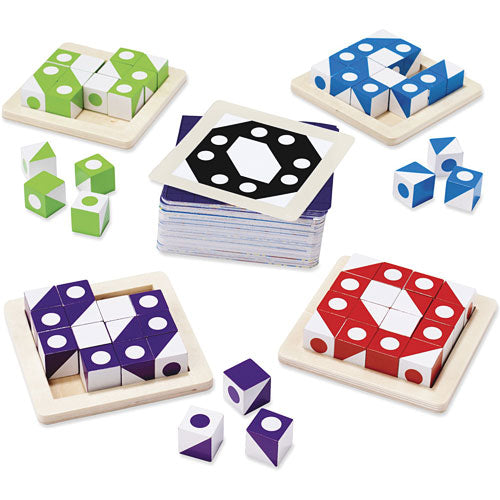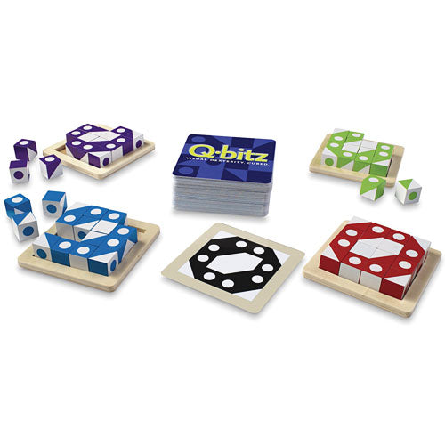 Say goodbye to boredom and challenge your mind and each other with this family-fun puzzle game! Q-bitz offers three types of visual challenges, making it the perfect game for multiple playing styles. Round one of this popular MindWare game is all about speed as players race to manipulate their cubes to copy the pattern on the Q-bitz pattern card. In round two, players roll all of their cubes on the table like dice. Using the cubes as rolled (face up), players place as many cubes as possible in the tray to recreate the pattern shown on the card. Players race to re-roll all remaining unusable cubes until they roll the shapes that are needed to complete the pattern. Round three really tests brain power: Players study the pattern card for ten seconds, flip it face down and then re-create the pattern from memory!