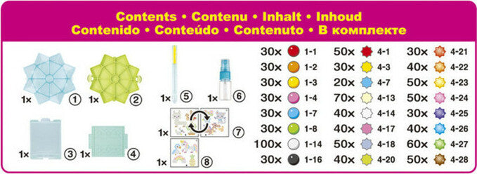 Complete kit includes star shaped bead case, flip tray, sprayer, template sheets, instructions and bead pen to help pick up and place beads onto the tray