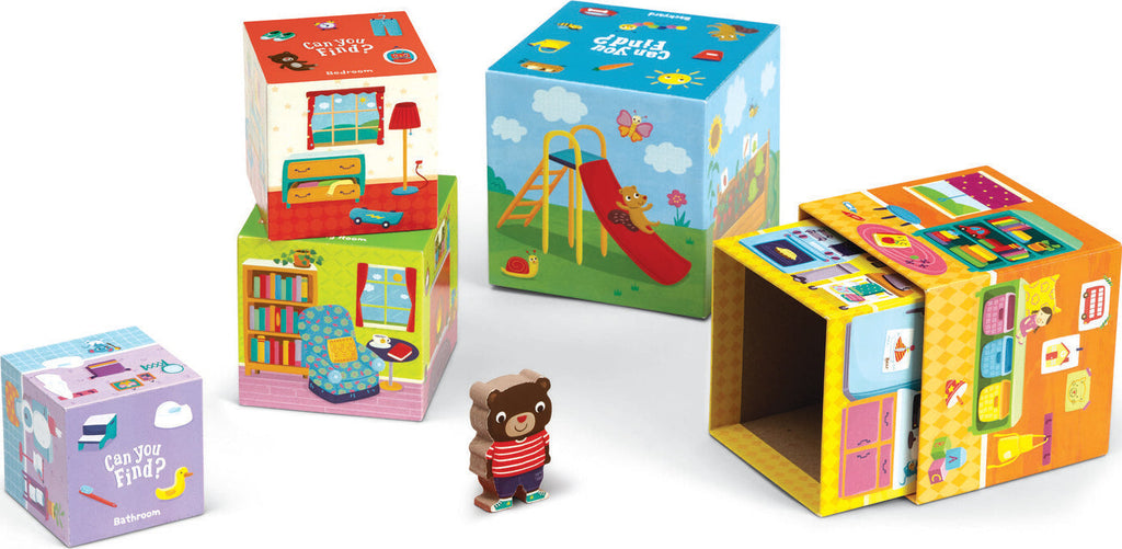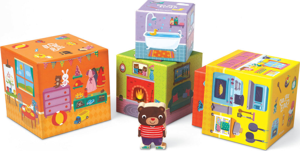 Where's Bear? combines two favorite activities -- stacking blocks and finding hidden objects -- into a game! Parents and kids take turns hiding and finding Bear under the sturdy nesting boxes. Each box illustrates the rooms in Bear's house and includes a matching game. A wonderful first board game for kids that was created specifically for you and your two year old. With 5 quick games in total, young players will have lots to explore and play with Where's Bear?