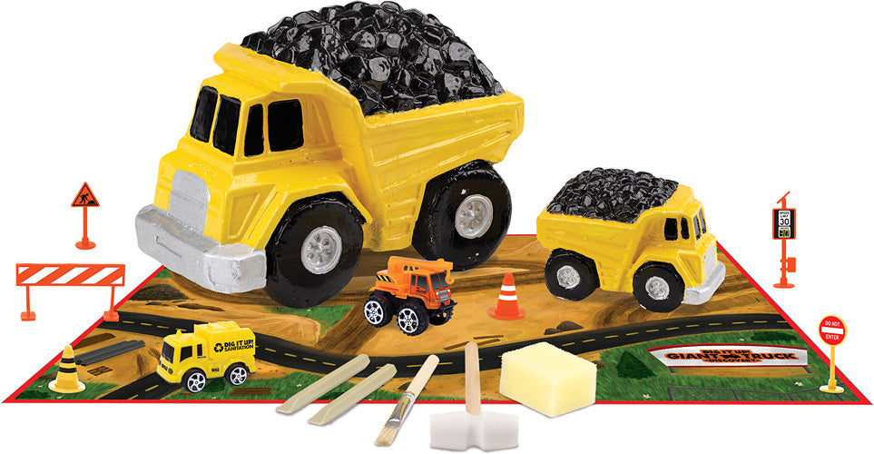 Caution, road work ahead! Use the five tough excavating tools to unearth seven trucks buried in one massive dump truck. Find the crane, bulldozer, dump truck, and more, each about 2" long, then turn the playmat into a construction site for even more fun. Set includes two chisels, 1 hammer, 1 brush, 1 sponge, 18 orange and yellow safety signs, plus a special guidebook to help identify your finds. Ready, set, dig!