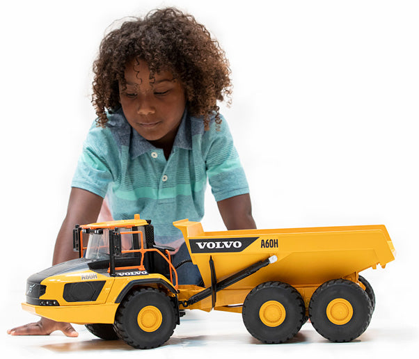 Haulers are true workhorses! Be it to efficiently transport bulk goods as part of earth-moving, asphalt as part of road construction, overburden in quarries and gravel pits, this tipper can rely on its strengths. As one of the most powerful tippers the Volvo A60H has now been added to the BRUDER themed world of construction equipment. Just like the real thing, the model guarantees exemplary off-road capabilities thanks to its solid articulated steering in conjunction with massive balloon tires One world figure can take a seat through the roof hatch of the extremely modern cab. Young hauler drivers can load and unload the genuine, enormous tipping trough.